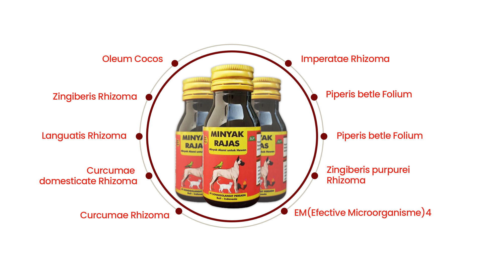 Minyak Rajas dalam kemasan botol dengan izin edar Kementan RI No.D.21656854 ATC dengan komposisi Oleum Cocos 84 %, Zingiberis Rhizoma 2%, Curcumae domesticae Rhizoma 2 %, Curcumae Rhizoma 2%, Imperatae Rhizoma 2%, Piperis betie Ralium 2 %, Curcumae aeruginosae Rhizoma 2 %, Zingiberis purpurei Rhizoma 2% dan EM4 0,25 %.